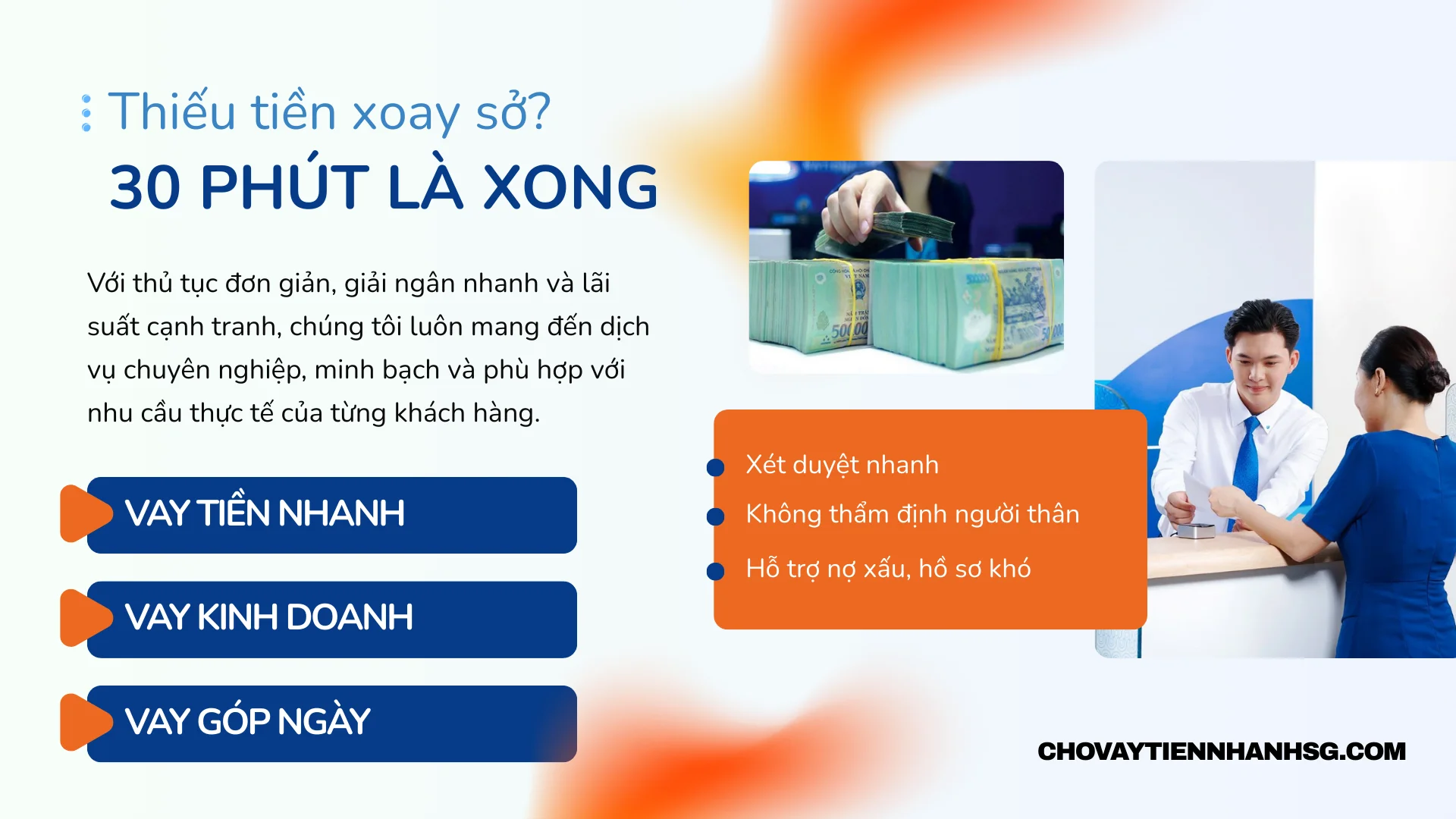 CHOVAYTIENNHANHSG.COM là đơn vị cung cấp giải pháp tài chính đáng tin cậy tại TP. Hồ Chí Minh, chuyên hỗ trợ khách hàng tiếp cận nguồn vốn nhanh và linh hoạt. Chúng tôi tập trung vào các dịch vụ như vay tiền nhanh, vay kinh doanh giúp bổ sung vốn kịp thời cho hoạt động buôn bán, và vay góp ngày phù hợp với người cần xoay vòng tài chính hằng ngày. Với quy trình đơn giản, xét duyệt nhanh và điều kiện vay linh hoạt, chúng tôi luôn nỗ lực mang đến giải pháp tài chính thuận tiện, minh bạch và phù hợp với nhu cầu thực tế của khách hàng.